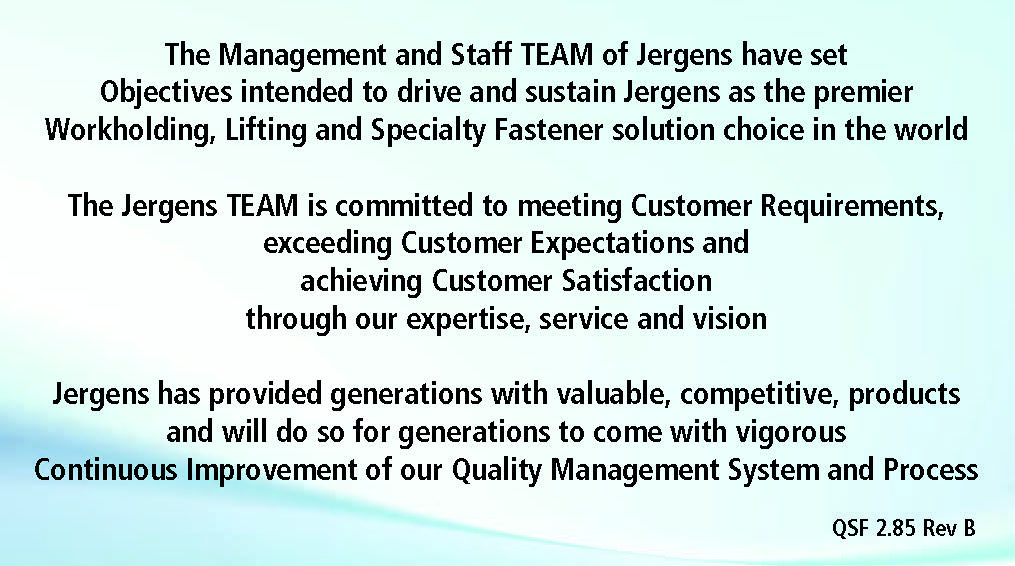 When it comes to quality, Jergens pays attention to detail. You can be sure that our products go beyond industry accepted standards, to provide you with unique features, dependable reliability and quality construction.